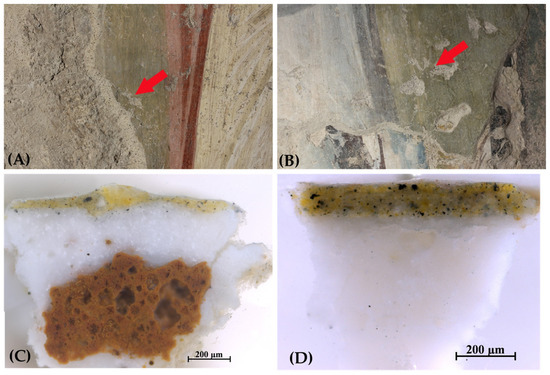 The green color obtained by mixing yellow ochre and vine black. (A) Image of the sampling point in the area of Angelo Bello; (B) image of the sampling point in the area of St. Anne and Child Mary; (C) cross-section of the sample taken from Angelo Bello; (D) cross-section of the sample taken from St. Anne. The red arrows in (A) and (B) indicate the exact points from which the samples, shown in (C) and (D) respectively, were taken.