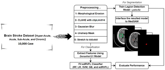 This study introduces a novel HEDL model for diagnosing and classifying ischemic brain strokes in CT medical images. The model has three main phases: (1) medical image enhancement and data preparation, using the Software Process Engineering Metamodel (SPEM) model to improve image quality and clarity for clinical stroke diagnosis; (2) the HEDL model, combining Dense Convolutional Network with 121 layers (DenseNet121) and Ensemble Deep Random Vector Functional Link (edRVFL) algorithms for their effectiveness with stroke image datasets; and (3) a novel approach for stroke lesion detection and segmentation, utilizing Medical Segmentation Anything Model (MedSAM) and the “You Only Look Once version 5” (YOLOv5) object detection model [18,19,20].