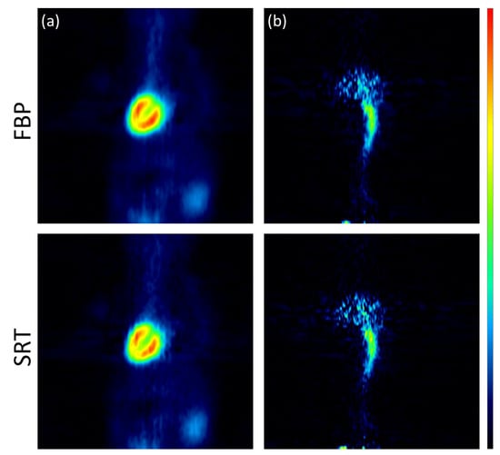 Analytic reconstructions using FBP and SRT. Coronal view of the myocardium (a) and the IVC (b) in a representative male C57BL/6 mouse. The figure was created via PMOD software [35]. The scalar values in the color bar range from zero (black) to the maximum (red) of each reconstruction algorithm.