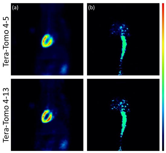 Iterative reconstructions using the two variants of the Tera-Tomo 3D algorithm, namely, Tera-Tomo 4-5 and Tera-Tomo 4-13. Coronal view of the myocardium (a) and the IVC (b) in a representative male C57BL/6 mouse. The figure was created via PMOD software [35]. The scalar values in the color bar range from zero (black) to the maximum (red) of each reconstruction algorithm.