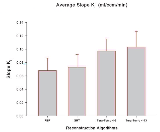 The averaged slope (mL/ccm/min) of the applied Patlak kinetic model for all four reconstruction algorithms employed, namely, FBP, SRT, Tera-Tomo 4-5, and Tera-Tomo 4-13. The averaged slope was calculated via PMOD software [35]. The results are illustrated as mean ± SD.