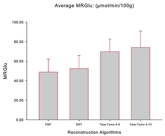 The averaged (mol/min/100 g) of the applied Patlak kinetic model for all four reconstruction algorithms employed, namely, FBP, SRT, Tera-Tomo 4-5, and Tera-Tomo 4-13. The averaged was calculated via PMOD software [35]. The results are illustrated as mean ± SD.