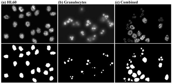 We opted to use synthetic data to study most aspects of our method since their ground truth annotations do not suffer from the inconsistencies a human annotator may induce. Thus, we can be confident that such external factors do not influence the outcomes of our experiments. Also, to isolate the effect of a particular type of inconsistency in the low-quality set, we apply perturbation functions (see Section 2.2.3) throughout the experimentation with synthetic data. We employ three data sets [], which consist of microscopy images of HL60 nuclei cells, granulocytes, and both cell types, respectively, produced by a virtual microscope [] extracted from the Masaryk University Cell Image Collection (https://cbia.fi.muni.cz/datasets) (accessed on 15 June 2023). Each data set consists of 30 volumes of 129 slices, each containing 16-bit pixels. We filtered the volumes by eliminating the slices with empty labels, which resulted in differently sized volumes, averaging 84 slices per volume. In addition, 25 volumes were used for training, while 5 volumes were kept only for testing. In Figure 1, we show sample slices and their corresponding high-quality annotations of the synthetic data sets. Since they are organized in volumes, we want to avoid selecting high-quality annotations of adjacent slices since such samples show little variation in their input and may be less informative when training the upgrade network than more distant slices. Consequently, we sample by subdividing a volume into a number of sections equal to the number of slices we want to select. We then select the middle slice of each section, thus ensuring an equidistant separation between slices. Additionally, when we sample from multiple volumes, we similarly partition each volume, but we select every next slice from a section belonging to a different volume in a circular manner. For instance, when taking a total of 5 slices from 5 volumes, the first slice will be selected from the center of section 1 from volume 1, the second from section 2 of volume 2 and so on.