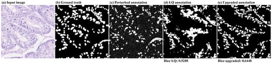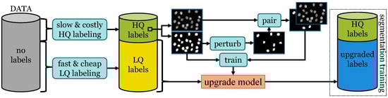 - Vădineanu, Ş.; Pelt, D.M.; Dzyubachyk, O.; Batenburg, K.J. Reducing Manual Annotation Costs for Cell Segmentation by Upgrading Low-Quality Annotations. In Proceedings of the Workshop on Medical Image Learning with Limited and Noisy Data, Vancouver, BC, Canada, 13 October 2023; Springer: Cham, Switzerland, 2023; pp. 3–13. [Google Scholar]