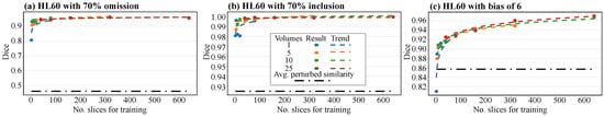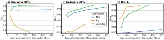 To assess the optimal training set size for the upgrade network , we created various training sets by varying both the total number of annotated slices and the number of volumes from which the annotated slices were selected. The models were trained to upgrade annotations affected by 70% omission, 70% inclusion, and a bias of 6, respectively. The results presented in Figure 4 show that the upgrade network requires just 5 well-annotated slices to improve the quality of the annotations, regardless of the applied perturbation. We also notice that the resulting quality of the upgraded annotations plateaus quickly to Dice values > 0.9. We report the optimal number of training slices for different perturbations together with the corresponding Dice score of the upgraded annotations in Table 1.