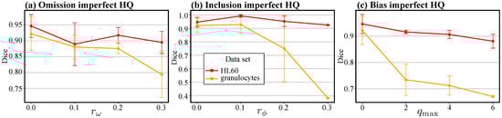In addition to the perturbation function, another essential requirement of our solution is the presence of a high-quality set of annotations for training . Since we use synthetic data, the quality of this set is ideal, which, however, is not expected from manual annotations for many reasons, including inter-observer variability [] or limited available resources. We model these inaccuracies by introducing moderate amounts of perturbations into the high-quality set. Figure 5 illustrates that the upgrade networks trained on the larger HL60 cells are robust to imperfect HQ annotations, whereas the ones trained on granulocytes are more sensitive due to the comparatively smaller footprint of the cells. Thus, the same amount of perturbation affects the quality of the granulocytes annotations more drastically than that of HL60 cells. Despite allowing for a moderate amount of omission and inclusion perturbations, the networks trained on granulocytes show a sharp drop in performance for bias since this type of perturbation introduces the greatest variation in shape relative to cell size among the two data sets.