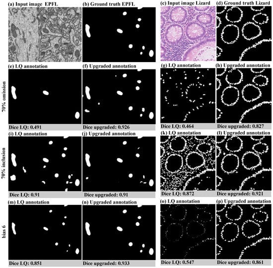 An example of perturbations applied to the real data sets paired with upgraded annotations. Figures (a–d) show the input image paired with its corresponding ground truth for EPFL and Lizard. Figures (e–p) present the perturbed-upgraded annotation pairs for 70% omission, 70% inclusion, and a bias of 6, respectively. The results below the images represent the Dice similarity between the ground truth, the low-quality annotations, and the upgraded annotations, respectively. Both metrics were computed on the entire test set.