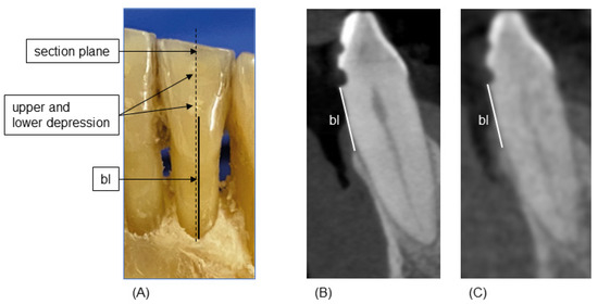 Reference measurements were collected as previously described [7]. Briefly, after radiological imaging, the gingiva were carefully removed using microsurgical instruments to ensure the buccal and oral bone were not damaged. Then, in the axis of the previously milled depressions, the distance from the most apical point of the lower depression to the alveolar crest was measured on the buccal and oral aspect of the investigated teeth using a 0.1 mm periodontal probe (Florida Probe, Clark Dental Equipment Systems Ltd., Cheshire, UK). This established a reference standard for buccal bone height (bl) measurements (Figure 1A). These measurements were made by one experienced investigator (M.R.), who had previously been calibrated on a model. For calibration, the investigator had to successfully reproduce (i.e., a relative agreement of 95%) the principal investigator’s (T.K.) bone-sounding measurements of clinical attachment loss at 168 sites on a standardized ex vivo reference model with transparent gingiva (Co. M. Tech, Seoul, Republic of Korea).