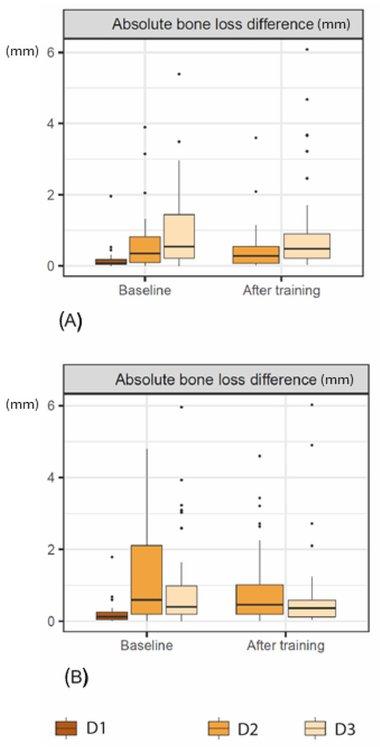 Boxplots of the raw and absolute bone-loss measurements (mm) at baseline and after training for each diagnostician (D1–D3) using (A) HD-CBCT and (B) LD-CBCT.