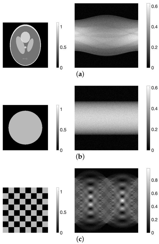 (a) Modified Shepp–Logan, (b) disc, and (c) chessboard digital phantoms (left) and their sinograms (right).