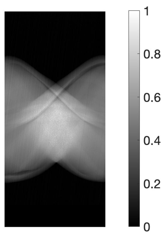 For the physical experiments, the projections were obtained using an X-ray CT scanner (Canon Medical Systems, Tochigi, Japan) and a body-simulated phantom [32] (Kyoto Kagaku, Kyoto, Japan). The scanner was operated at an 80 kVp tube voltage and 30 mA tube current, with an exposure time of 0.75 s per rotation. This setting pertains to conditions where imaging is conducted under relatively high levels of measurement noise. Figure 2 illustrates the sinogram, a two-dimensional array of data containing the projections , where (957 acquisition bins and 450 projection directions spanning 180 degrees). The size of the reconstructed image was ().