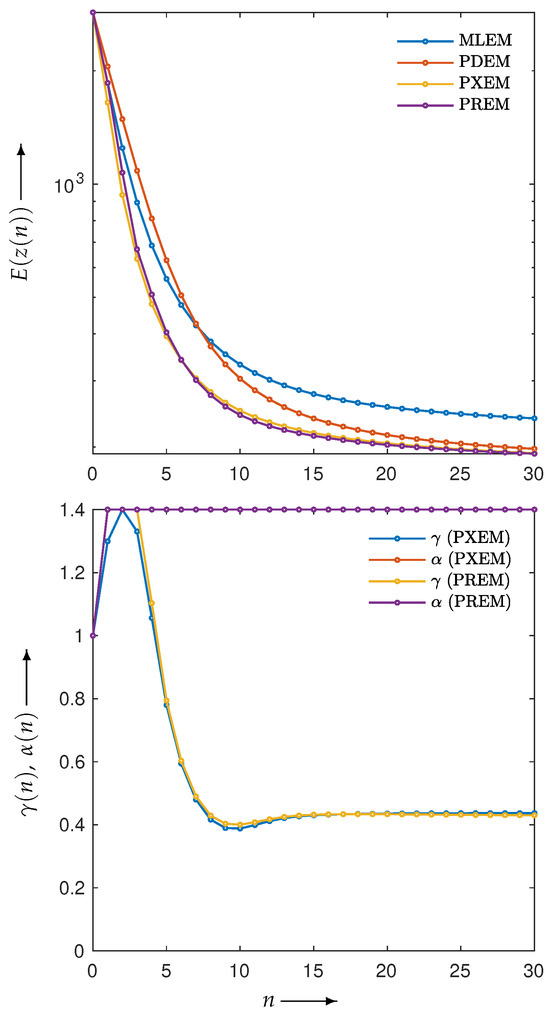 Change in evaluation function with respect to the number of iterations n needed to reconstruct Shepp–Logan phantom images using MLEM, PDEM, PXEM, and PREM (upper), and plot of parameters and for image reconstructions using PXEM and PREM (lower).