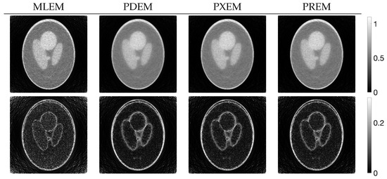 Images reconstructed from Shepp–Logan phantom images using MLEM, PDEM, PXEM, and PREM (upper) and their corresponding subtraction images (lower).