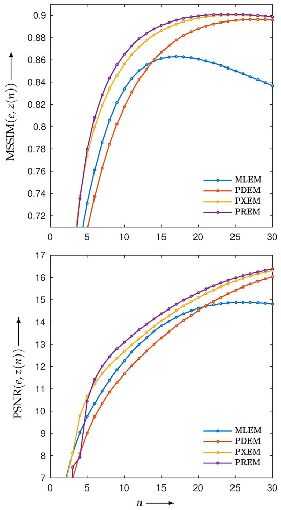 Change in MS-SSIM () (upper) and PSNR () (lower) with respect to the number of iterations n needed to reconstruct image of Shepp–Logan phantom by using MLEM, PDEM, PXEM, and PREM.