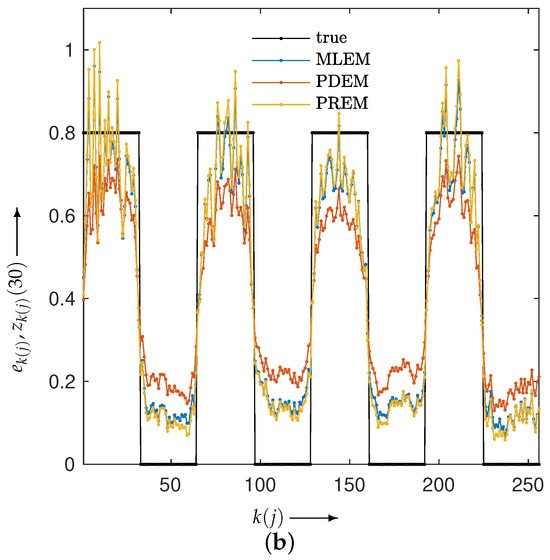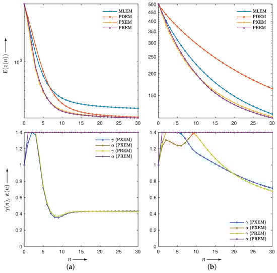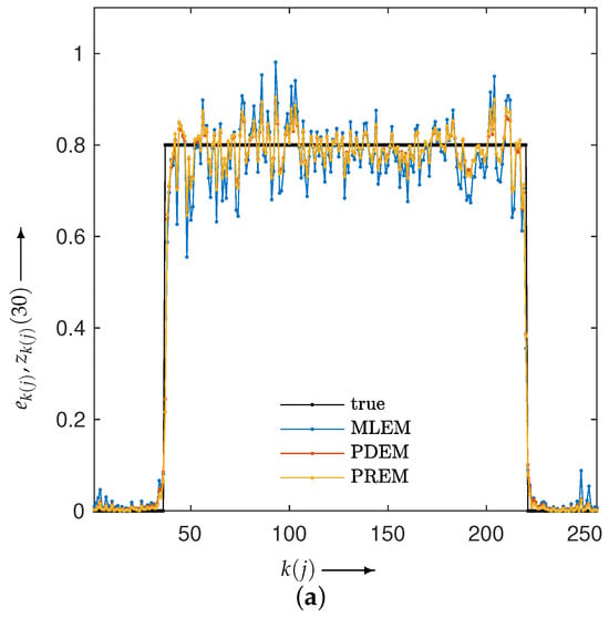 First, let us examine the results of the numerical experiments. The reconstruction was performed using the MLEM, PDEM, PXEM, and PREM methods on the Shepp–Logan phantom image in Figure 1a. Figure 3 (for ) plots the evaluation function and the parameters used in the PXEM and PREM methods versus the iteration number n. As indicated in the figure, PDEM had a lower evaluation function value than that of MLEM from the middle of the iterations onward, and the evaluation function value at iteration N was significantly smaller than that of MLEM. This is because the fixed parameters of PDEM are chosen in a way that reduces the evaluation function at the maximum number of iterations N. On the other hand, PXEM and PREM showed smaller evaluation function values than those of PDEM or MLEM at all iteration numbers. As for the parameters, PXEM and PREM showed almost identical changes, indicating that the method using the reduced-size system worked as intended. Regarding the computational time needed for reconstruction, PDEM and MLEM each took approximately 14 s, while the additional time required to obtain the parameter sequence for each iteration using the reduced-size system was 4 s (approximately 30% more time than the computation at the original size). The parameter plot shows that quickly reached an upper limit value, while starts out large at low iteration numbers and converges to around 0.4. This property is in accord with the results of previous studies [22] investigating the iteration numbers at which PDEM demonstrates high performance. Overall, these results confirm the effectiveness of the proposed methods, PXEM and PREM.