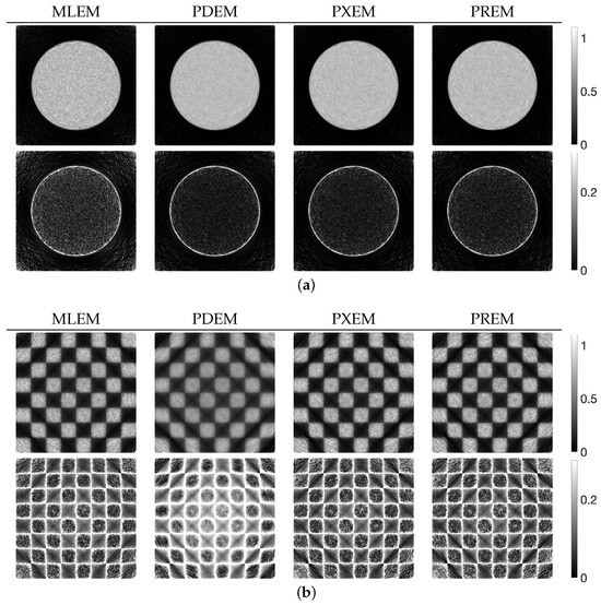 Images reconstructed from (a) disc and (b) chessboard phantom images using MLEM, PDEM, PXEM, and PREM (upper) and their corresponding subtraction images (lower).