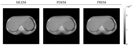 Images reconstructed from sinogram obtained from X-ray CT scanner by using MLEM, PDEM, and PREM (the white horizontal lines on the images indicate the positions of the density profiles in Figure 11).