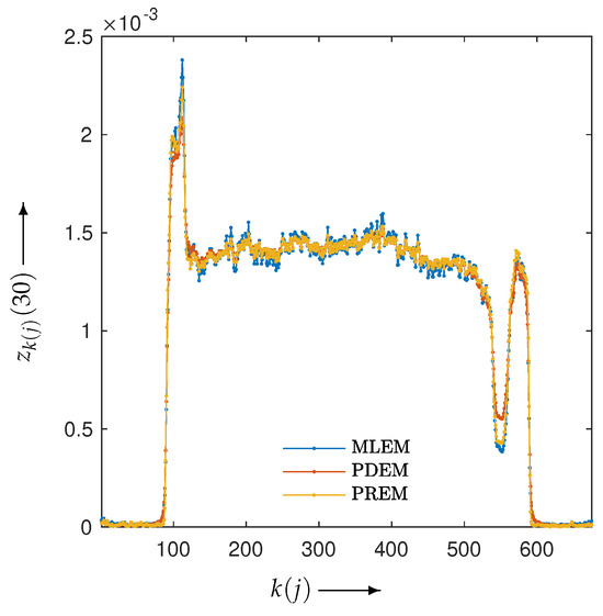 Next, let us examine the results of the physical experiment. The MLEM, PDEM, and PREM methods used the projections shown in the sinogram of Figure 2. The preprocessing time for the parameter estimation in PREM using the reduced-size system was 67 s, which represented an additional 32% of the reconstruction time compared with the original size, which took 207 s. Additionally, Figure 9 plots the changes in the evaluation function and parameters of PREM. Similarly to the numerical experiments, the proposed method operated appropriately. In the transition of the evaluation function, PREM significantly reduced the function value with fewer iterations compared with MLEM and PDEM. The reconstructed images and the density profile are shown in Figure 10 and Figure 11, respectively. The term in the figure denotes the index k on the white horizontal line in the reconstructed image , where . The profile shown in Figure 11, where there are gradual changes in density (in the range of indices from approximately 150 to 500) and sharp transitions (around index 550), indicates that PREM effectively suppressed artifacts caused by noise to a level comparable to PDEM, maintained sharp edges with the same contrast as MLEM, and combined the strengths of PDEM and MLEM.