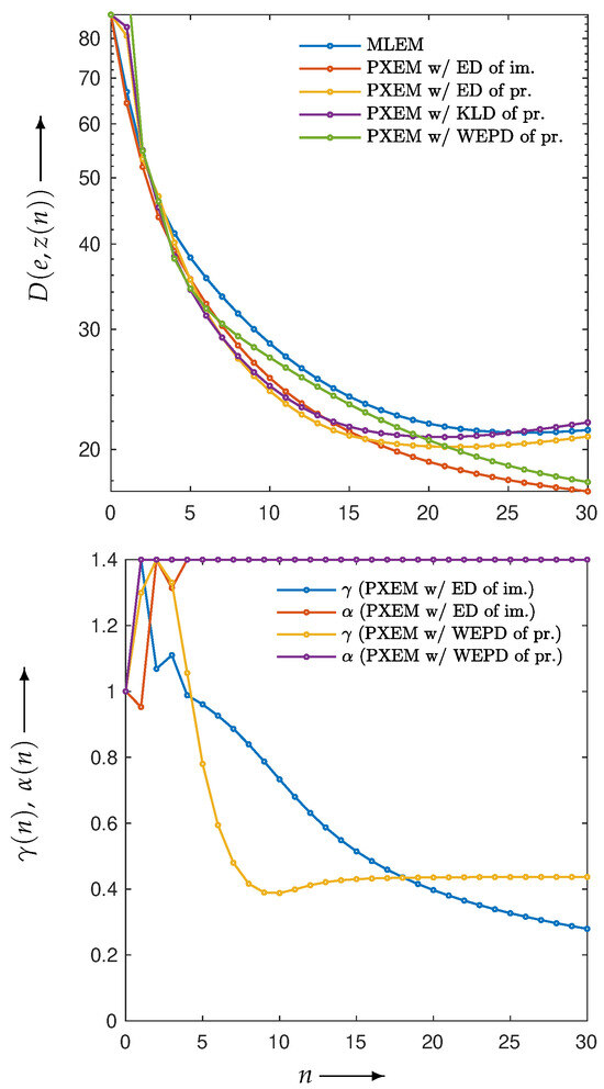 The performance of algorithms, in terms of convergence or image quality, depends on the objective function [18,19,20,21] that decreases the differences iteratively. An iterative algorithm using the extended power divergence [22] (EPD) as an objective function has been proposed. This algorithm, referred to as the power divergence-based expectation-maximization (PDEM) method, provides higher convergence performance and better-quality reconstructions compared with the MLEM method by choosing appropriate constant values of two parameters throughout the iteration process. One way to determine parameter values that yield effective results is to use machine learning [23], but this requires pre-training on various imaging subjects and noise levels.