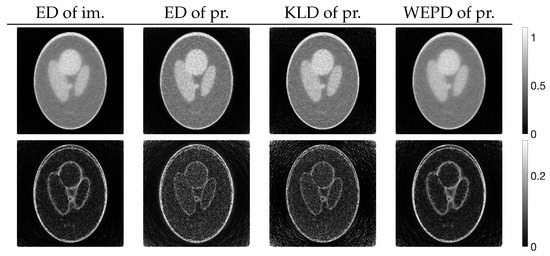 Images reconstructed from Shepp–Logan phantom using PXEM with parameter optimization functions of Euclidean distance (ED) of images, ED of projections, KL-divergence (KLD) of projections, and weighted extended power divergence (WEPD) of projections (upper) and their subtraction images (lower).