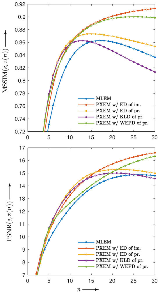 for , of images reconstructed by using PXEM with the parameter optimization functions defined in Equation (10) and Equations (14)–(16) as well as images using MLEM for comparison. Figure 12 (lower) plots the parameter changes for Equations (10) and (16). In the upper part of Figure 12, it is a well-known phenomenon that the function D with MLEM increases with a large number of iterations due to the relatively heavy noise added to the projections. On the other hand, with PXEM using Equation (16) based on the true image, the function value monotonically decreases as the number of iterations increases. Comparing the results of Equations (10), (14), and (15), which are functions of the measured and forward projections, reveals that only the case of Equation (10) exhibits a monotonic decrease. A visual assessment of the quality of the reconstructed images in Figure 13, as well as the evaluations using MS-SSIM and PSNR in Figure 14, confirms the superiority of the approach using Equation (10) for parameter optimization.