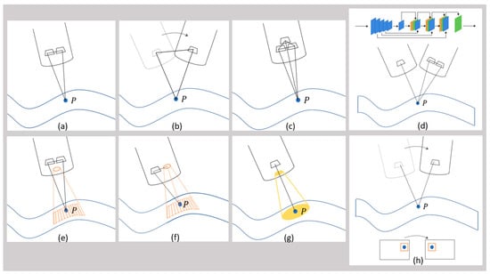 Image-based 3D reconstruction techniques can be divided into passive (only image is used) and active (additionally, external light is brought onto the object’s surface) methods []. Most of them make use of triangulation to estimate depth (distance from camera to object). Shape-from-Motion (SfM) [] (Figure 1b) and Shape-from-Shading (SfS) [] (Figure 1g) belong to the category Shape-from-X (SfX) and are declared as passive methods. Stereo vision [] (Figure 1a), trinocular [] (Figure 1c) or multicamera systems [], as well as Simultaneous Localization and Mapping (SLAM) [] (Figure 1h) are passive methods as well. Deep-learning (DL) approaches (Figure 1d) are trained with either mono- or stereoscopic images and can also be assigned to passive methods [,,,,,,,,,,]. Active methods are Time-of-Flight (ToF) cameras [] and Structured Light (SL) [] (Figure 1e (SL stereo), f (SL mono)). ToF will not be presented in this paper because within the last nine years, we could not find any paper using ToF for 3D reconstruction in laparoscopy. At last Smart Trocar® and Light Field Technology must be mentioned. The first one is a trocar equipped with cameras to record the laparoscope’s and instruments’ positions []. Light Field Technology is another passive method but is barely used in laparoscopy [].