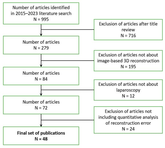 For literature search, the engines “PubMed” and “google scholar” were applied by setting the keywords to “3D reconstruction laparoscopy”, “three-dimensional reconstruction laparoscopy”, and “surface reconstruction laparoscopy”, while the year of publication was set to 2015–2023. Articles were excluded if not about image-based 3D reconstruction techniques, if not about laparoscopy, and if a quantitative analysis is missing (see Figure 2) []. In total, 995 articles were found, which were filtered by reading the title, the abstract, and the keywords. Out of those, 716 articles were excluded after title review, 195 articles were excluded because they did not talk about image-based 3D reconstruction, and 12 articles were removed due to the missing topic of laparoscopy. Exclusion criteria led to 72 articles. The last criterion—the presence of the quantitative evaluation of the reconstruction error, especially the RMSE and the MAE—excluded 24 articles. Thus, 48 articles were considered in this review containing studies of image-based 3D reconstruction in laparoscopic applications from full-text articles, conference-proceedings, and abstracts.
