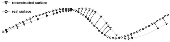 The quantitative evaluation of a reconstructed surface requires the ground truth of the reference model. Most authors measure the accuracy by computing the reconstruction error, which is described as the Euclidean distance (see Figure 3: black lines) between each reconstructed surface point (see Figure 3: triangles) and its corresponding closest point on the real surface (“corresponding point pair”, see Figure 3: grey colored circles). The following metrics could be applied to evaluate the distance: mean absolute error (MAE), magnitude of relative error (MRE), standard deviation (STD), root mean squared error (RMSE), root mean squared logarithmic error (RMSE log), absolute error (AbsRel), and squared error (SqRel) (see Table 2). The MAE and the RMSE can be found in most articles, which is why we focus on these metrics [].