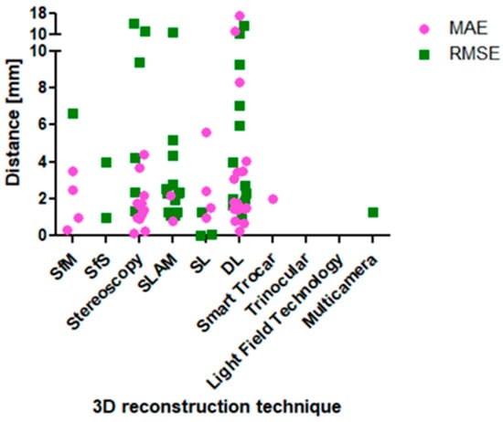 (1) Based on the RMSE and MAE data set, two SL, one SfM, one stereo vision, and one DL approach deliver an accuracy below one millimeter. Refs. [,] could deliver RMSE values below one millimeter. The SL approach in Ref. [] is based on stereo images and achieved the lowest reconstruction error of 0.0078 mm (plate and cylinder as reference object), while Ref. [] results in 0.07 mm RMSE (cylinder). Based on the MAE data set, a SfM (0.15 mm) (ex vivo bovine liver), a stereo vision (0.23 mm) (in vitro porcine heart images), and a DL approach (0.26 mm) (Hamlyn centre dataset) delivered the highest accuracy below one millimeter [,,]. When only focusing on intraoperative organ data as reference objects and RMSE values, the best results are achieved by a SLAM approach with a value of 1.1 mm [] (in vivo porcine abdominal cavity).