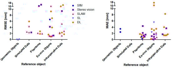 Figure 5 visualizes the RMSE and MAE in dependence of the 3D reconstruction method and the reference object. (Simple) geometric objects, simulated environments, phantom organs, ex vivo organs, and intraoperative data could be found in the literature. In this order, the intraoperative data are the most complex and challenging to reconstruct. Thus, the expectation is that the reconstruction error increases with increasing complexity of the reference object. Due to a high variation of the reconstruction error, this tendency can only be observed slightly in Figure 5. The two SL approaches achieving RMSE values of 0.07 mm [] and 0.0078 mm [] can be found in the category of geometric objects of the left diagram of Figure 5 (plate and cylinder as reference object, left diagram in Figure 5). It would be supportive to validate these results on in vivo organs. In contrast to that, the SL approach of Ref. [] results in 1.28 mm (RMSE, category ex vivo organ in the left diagram of Figure 5). The three mentioned articles did not measure the MAE, but Ref. [] did. There, a monocular SL system was built and reached 1.0 ± 0.4 mm MAE (phantom as reference object, right diagram in Figure 5), which is close to submillimeter accuracy. Here, it would be supportive to measure the RMSE as well because it weighs outliers more and is the more critical and representative metric. In summary, the performance of SL approaches cannot be stated when only tested on simple geometric objects, phantoms, or ex vivo organs—additionally intraoperative data are necessary.