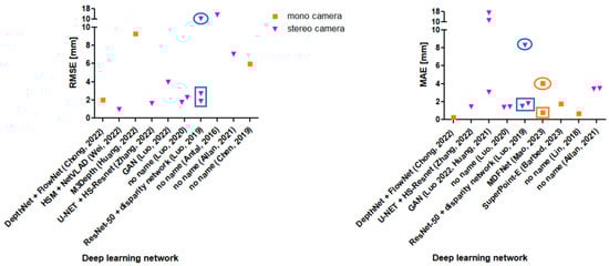 Visualization of the RMSE values from the Refs. [,,,,,,,,,] in relation to the deep learning network and the number of cameras (left); Visualization of the MAE values from the Refs. [,,,,,,,,,] in relation to the deep learning network and the number of cameras (right); the rectangle boxes marks the data from phantom organs and the circles mark the data from in vivo images.