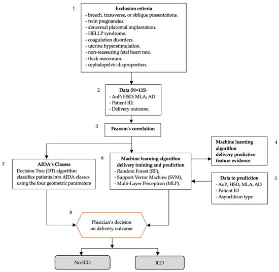 The workflow of the AIDA on predicting delivery outcomes using machine learning algorithms and geometric parameters measured during labor is illustrated in Figure 1. The flowchart utilizes boxes that align with those defined by the WHO Intrapartum Care Algorithm Working Group []. The process is as follows: (1) exclusion criteria are listed at the top, detailing conditions that would exclude patients from the study; (2) data collection (N = 135) includes four geometric parameters (AoP, HSD, MLA, AD), patient ID, and delivery outcome; (3) Pearson’s correlation is performed on the collected data. The process then splits into two parallel tracks: the first being AIDA’s Classes (5), where a decision Tree (DT) algorithm classifies patients into AIDA classes using the four geometric parameters; and the second being machine learning algorithm delivery training and prediction (6), which uses random forest (RF), support vector machine (SVM), and multi-layer perceptron (MLP) algorithms defined in AIDA []. Both tracks feed into (8), the “physician’s decision on delivery outcome” step. The final outcomes are categorized as either no-ICD (no intrapartum cesarean delivery) or ICD (intrapartum cesarean delivery). There are additional elements showing (4) machine learning algorithm delivery predictive feature evidence; and (5) data used for prediction (AoP, HSD, MLA, AD, patient ID, and asynclitism type).