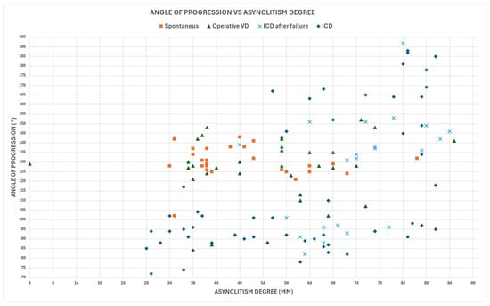 Over the past three decades, the integration of ultrasound technology in delivery rooms has significantly enhanced the diagnosis of both asynclitism and other fetal malpositions [,]. This advancement has provided clinicians with a more accurate and objective method for assessing fetal head position and alignment during labor, overcoming many of the limitations associated with traditional digital examination techniques. Intrapartum ultrasound has particularly improved the detection and quantification of asynclitism, allowing for more precise evaluation of its degree and potential impact on labor progress. To minimize complications for both mother and fetus [], accurate diagnosis and precise measurement of the degree of asynclitism are crucial for guiding appropriate management decisions, particularly in cases of pronounced asynclitism, and especially when considering operative vaginal delivery or cesarean section []. If asynclitism is diagnosed during prolonged dystocic labor under neuraxial analgesia, it is more crucial to decide on the delivery mode and stop using analgesic medications.