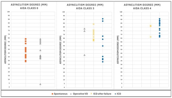The distribution of AD values, measured concurrently with AoP, HSD, and MLA, for 101 out of 135 cases from the AIDA study [], is illustrated in Figure 3. The cases are categorized into three AIDA classes and further subdivided by asynclitism type. In AIDA class 0, comprising 40 cases with AD ranging from 4 mm to 64 mm, there were 23 cases of anterior asynclitism and 17 cases of posterior asynclitism. AIDA class 3 included 38 cases with AD ranging from 29 mm to 89 mm, consisting of 8 cases of anterior asynclitism and 30 cases of posterior asynclitism. AIDA class 4 contained 23 cases with AD ranging from 67 mm to 91 mm, including 8 cases of anterior asynclitism and 15 cases of posterior asynclitism.