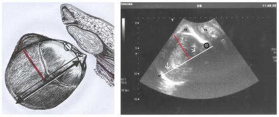 To make the diagnosis of asynclitism even clearer and more understandable, Figure 4 presents a comparative illustration of anterior asynclitism in fetal head positioning. The left panel features a schematic drawing of a longitudinal translabial ultrasound view. It depicts the fetal head in the right occiput position with anterior asynclitism. A red line demarcates the degree of anterior asynclitism, measured as the distance between the sagittal suture (represented by a thick black line) and the left parietal bone.