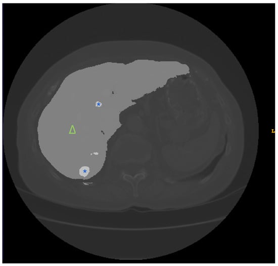 Example images from the LiTS dataset []. LiTS, Liver Tumor Segmentation Challenge. The triangle (∆) represents the liver region, and the asterisk (*) represents the lesion area.