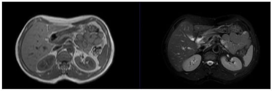 The classic Segmentation of the Liver (SLIVER07) dataset contains CT images of diseased livers and, like the 3DIRCADb, is used widely to evaluate and train liver segmentation algorithms [,,,,,,,]. However, it is an older dataset that may not include newly identified lesion types or images acquired using the most current technology. The recently published Tumor and Liver Automatic Segmentation (ATLAS) dataset (Figure 3) [] focuses on liver and tumor segmentation by contrast-enhanced magnetic resonance imaging (MRI), especially for inoperable hepatocellular carcinoma. It is the first public dataset to offer annotations for this context, with the aim of optimizing contouring in liver cancer treatment planning. However, the compatibility of this newer dataset with broader applications remains to be validated. The Combined (CT-MR) Healthy Abdominal Organ Segmentation (CHAOS) dataset (Figure 4) contains healthy kidney, liver, and spleen imaging data from 80 patients in Digital Imaging and Communications in Medicine format, with ground-truth masks annotated by certified radiologists to ensure accuracy and reliability [,,]. This dataset supports research on cross-modality medical image processing, but the small patient sample size may limit the generalizability of models and large-scale evaluation, and the provision of data from only healthy organs may restrict its applicability in disease-specific research.
