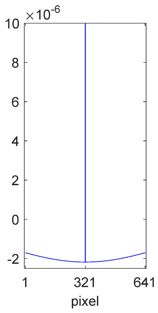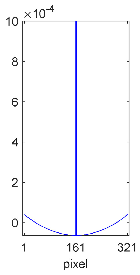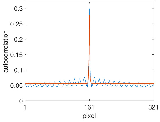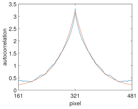 Following the algorithm detailed in Section 3.6, we calculated the colour signal autocorrelation matrix using scan lines from the 222 images in the dataset. (For convenience, the images were first resampled to 641 pixels on the shorter side). For the unknown shadings present, we assumed a 50:50 mix of slowly varying sinusoids and linear ramps in the range = , also 641 pixels in length. This provided an approximately smooth shift-variant estimate of using Equation (38), which was then mapped to the closest-fitting analytic Mondrian autocorrelation matrix using the central quadrant. A diagonal cross-section of the fit is shown in Figure 15. The value for was found to be = 0.99. A cross-section of the resulting 641 by 641 pixel filter, , obtained from solving the optimisation, was shown in Figure 1.