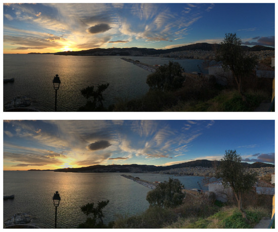 Land [5], when performing his analogue experiments, took the global mapping function, g, to be the logarithmic function in order to approximate the nonlinear relationship between relative reflectance and lightness as perceived by the HVS [10]. Significantly, Jobson et al. [6,7] also took g to be the logarithmic function. However, it has since been argued that such a nonlinear mapping is not appropriate when dealing with retinex output displayed on electronic devices [9,11], and some authors proposed a simple linear stretch to the output range instead [11,12,13]. Indeed, the convolutional retinex algorithm of Jobson et al. [6,7] renders image lightness, particularly in darker areas of the image, in a manner that goes beyond the original premise of retinex, which was simply to mitigate gradients in the illumination, i.e., shading. Instead, Jobson et al.’s algorithm can be regarded as a local tone-mapping operator (TMO) for image enhancement that is tuned to provide visually pleasing images [8,14,15].
