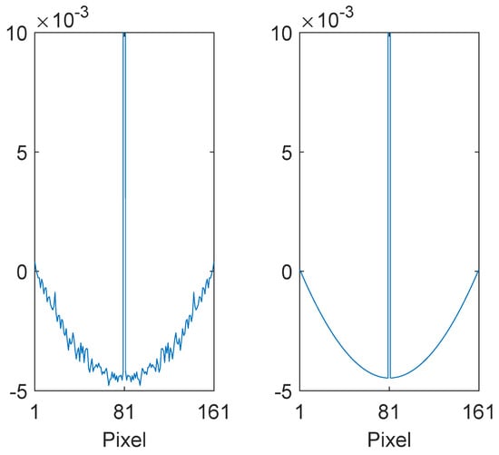 (left) Example one-dimensional filter of length p = 161 pixels obtained using Hurlbert and Poggio’s numerical method [30] with 1,000,000 pairs of training vectors. The illustration has been cropped close to the horizontal axis for clarity. (right) The corresponding filter obtained using our analytic reformulation.