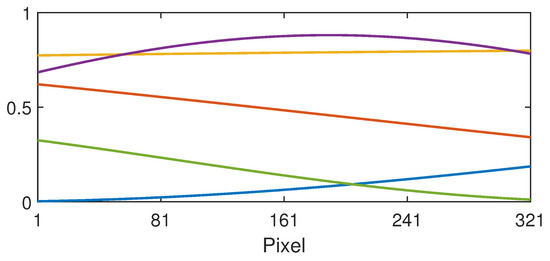 Example sinusoidal shadings (denoted by curves of different colours) in the range = , defined by Equation (25) with the minimum wavelength of = 2, i.e., twice the length of the training vectors (p = 321 pixels). Evidently, many of these sinusoids are approximately straight line gradients.