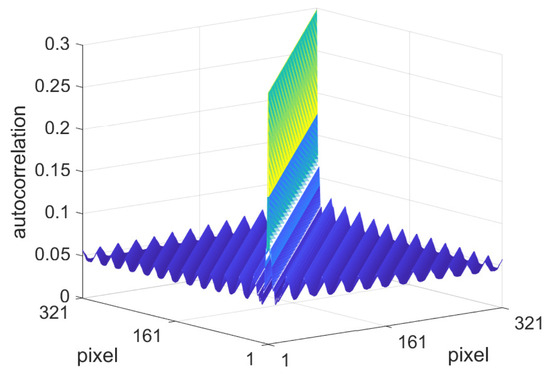 The autocorrelation matrix , Equation (29), is illustrated as a mesh plot in Figure 6, where the minimum wavelength was taken to be = 2, i.e., twice the length of the training vectors. It has a Toeplitz structure due to the shift invariance that arises from the integration over phase . Clearly, the autocorrelation decreases with distance from the main diagonal due to the reduced correlation between pixel values separated by a sinusoidal function with a minimum wavelength of = 2.