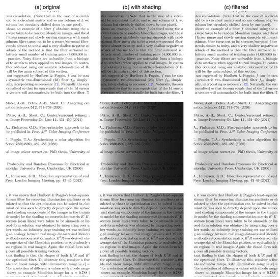 The next section of this paper begins with a brief summary of the original least squares optimisation approach to retinex taken by Hurlbert and Poggio [30]. Subsequently, full mathematical details of our analytic reformulation are provided, along with full implementation details, which were not presented in our earlier publication [29]. In Section 4, an optimal filter for removing shading applied to text documents is calculated. Significantly, this application provides an error analysis for the method since the original shading-free PDF pages can act as the ground truth. We also show how to determine an optimal filter for the TM-DIED dataset [32], which was designed to contain images taken in challenging lighting conditions.