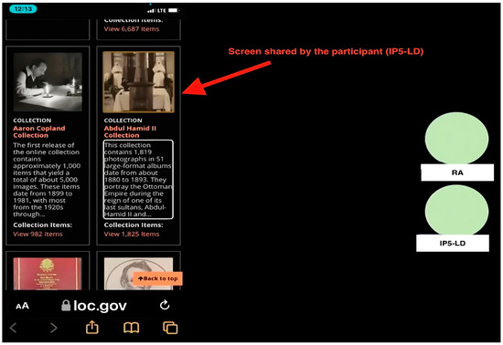 The following is the data collection procedure. First, participants completed the pre-questionnaires to provide background information (e.g., demographic information, information search skills, and experience of using DLs). Second, each participant joined an online meeting via Microsoft Teams using their own devices in their natural settings to work on three tasks, including one orientation task and two search tasks (a specific search and an exploratory search) on each of the two DLs. Before the search tasks, they completed one 10-min orientation task to familiarize themselves with the assigned DLs. Table 2 presents three task types and associated examples. Third, think-aloud protocols were used when participants worked on the tasks. Specifically, they were instructed to talk continuously about their thoughts and actions in relation to their interactions with each DL, specifying their intentions for their actions, the problems they encountered, and their solutions. At the same time, transaction logs were recorded. We incorporated a screenshot of a participant’s shared screen to help readers understand a participant’s study setting. Figure 1 presents the Microsoft Teams meeting interface. Fourth, post-system interviews were conducted after each DL to solicit information about participants’ experiences and perceptions of the accessibility and usability of each DL. A post-search interview was conducted at the end of their participation to gather a final assessment of the two selected DLs. Participants’ interactions with DLs during tasks and interviews were recorded using Microsoft Teams, and video and transcripts were exported for analysis.