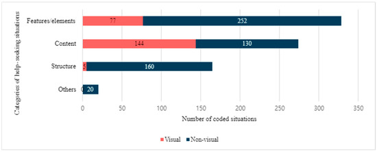 As a result of the open coding analysis, it was found that participants experienced a total of 788 instances of help-seeking situations. On average, each participant encountered approximately seven help-seeking situations while completing their tasks. The features/elements category (n = 329) was the most frequently coded, constituting approximately 41.8% of the total coded situations instances, with 77 instances (23.4%) related to difficulties in visual interaction (Figure 2). The content category (n = 274) accounted for about 34.8% of the coded help-seeking situations instances, with 144 (52.6%) associated with visual interactions. About 20.94% of the help situations are associated with the structure category (n = 165), with only five instances (3.03%) associated with visual interactions.