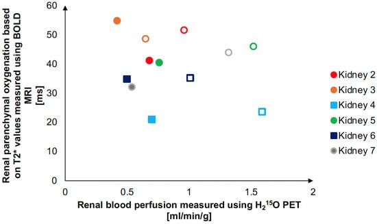 Graphical visualization of the association between RBP and RPO. The graph visualizes the association between the renal blood perfusion measured in renal cortex (based on H215O PET dynamic uptake measurements) and the simultaneous measurement of renal parenchymal oxygenation (MRI measured apparent relaxation time in renal cortex, T2*, BOLD MRI). Filled symbols: flow setting 1, open symbols: flow setting 2.