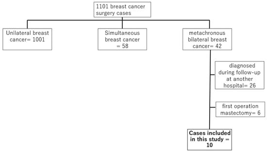 Algorithm for the cases included in this study. The number of cases operated on at the hospital was 1101. There were 1101 cases of unilateral breast cancer, 58 cases of simultaneous bilateral breast cancer, and 42 cases of heterochronic bilateral breast cancer. Twenty-six cases of contralateral breast cancer were noted during follow-up at other hospitals, and six cases of total resection were performed as the initial surgical procedure, making ten cases eligible for this study.