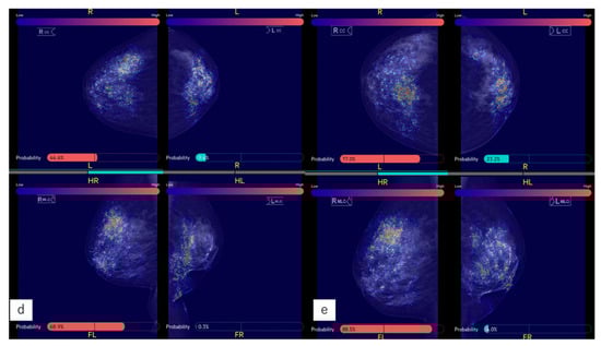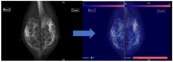 We used the MG AI system FxMammo® (FathomX Pte Ltd., Singapore). The AI system is based on deep learning and has been put into practical use in Singapore and other countries. The mechanism of FxMammo has been described in previous studies. The AI system is based on the VGG-16 network []. The VGG network is one of the most used feature extractors in medical imaging classification []. The AI was created by collecting 17,769 cases (of which 45% were malignant) from 10 institutions in Taiwan, Thailand, Singapore, Hong Kong, China, Malaysia, and Japan. Since 2019, we have been collaborating with the National University of Singapore to develop MG AI for Asian women. This AI model, which utilizes CNNs and graph convolutional networks, quantifies the probability of malignancy and highlights areas of interest on a heat map when mammography images are uploaded. The model demonstrated a high Area Under the Curve (AUC) of 0.902 for BC detection []. If we assume a cancer miss rate of 3%, it is estimated that up to 38% of normal MG could be safely excluded from human review. In Japan, the AI system has not been approved for clinical use and it is used for research purposes. Four MG images (craniocaudal [CC], mediolateral oblique [MLO], left, and right) taken before surgery for heterochronic contralateral BC were transferred from the reporting system to the AI system where the MG data were analyzed. The threshold value was set to 40.0%, (91.5% sensitivity and 82.0% specificity). The AI system indicated the probability of malignancy for each of the four cards as a percentage. In addition, areas in which the AI system was interested were displayed in color on a heat map. The areas on which the AI system focused when analyzing the image are visually shown as a heat map (Figure 2).
