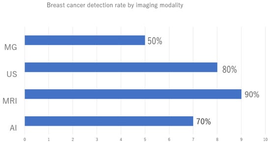 Breast cancer detection rate by imaging modality. Mammography (MG), ultrasonography (US), Magnetic Resonance Imaging (MRI), and the artificial intelligence (AI) system to diagnose the degree of malignancy. The highest diagnostic accuracy was 90% for MRI, followed by US, AI systems, and MG read by radiologists, in that order.