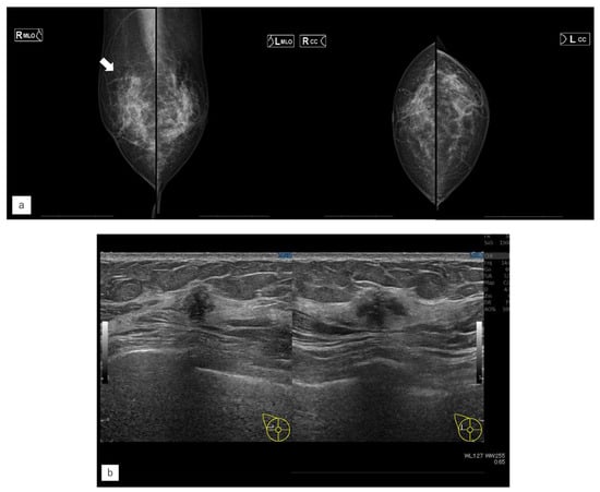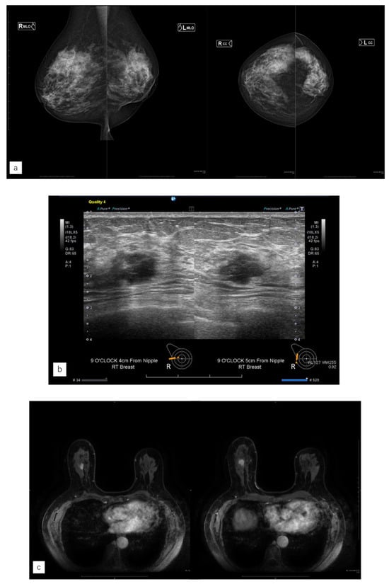 Mammography (MG) is widely utilized for BC screening, and its use has been associated with reduced mortality rates []. However, MG presents several challenges. Dense breast tissue, which is prevalent among young Asian women, can obscure cancer detection on MG and diminish its sensitivity []. Additionally, the risk of developing primary contralateral BC is estimated to be two to six times higher than that of developing a second BC in the general population [,,]. Women under 50 years of age who develop contralateral BC within five years of their first diagnosis face a mortality risk that is 3.9 times greater than that faced by those with unilateral cancer []. Although the combined use of MG and Magnetic Resonance Imaging (MRI) shows 67% sensitivity and 50% specificity for detecting metachronous contralateral BC post-unilateral surgery [], the guidelines currently recommend only physical exams and MG every 6–12 months for postoperative surveillance without endorsing further imaging tests [,].